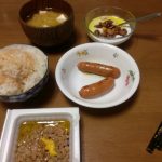 納豆ご飯、ナゲット、塩辛、みそ汁、まるごとソーセージ、ヨーグルト